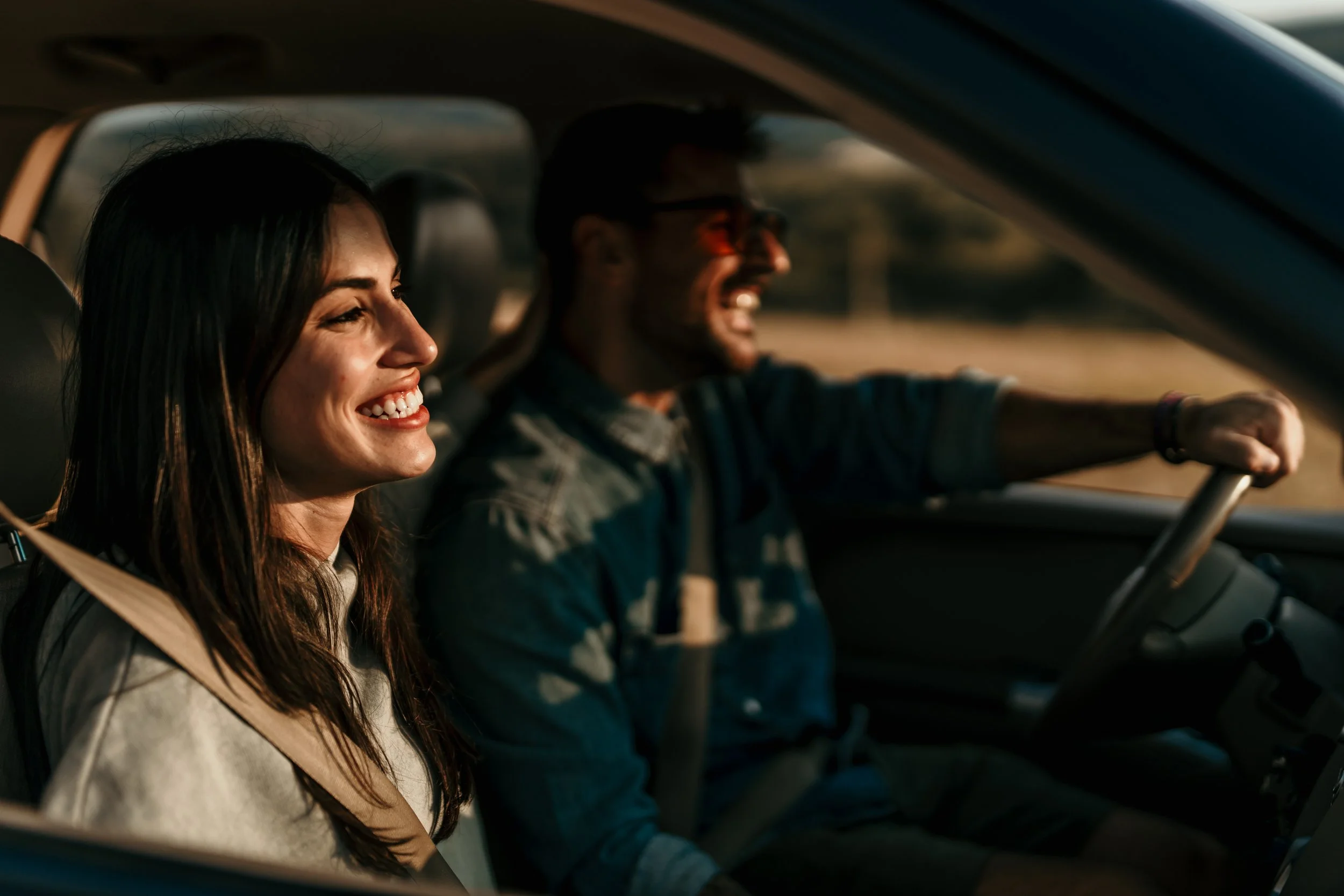 A smiling couple with curly hair embracing in an outdoor landscape at sunset.